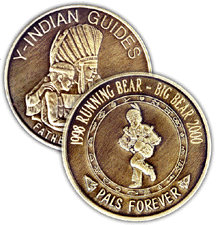 Charlie, then a commercial photographer, was making a photo of a commemorative medal for the United States Postal Service when he had the idea. Photos and paintings of American Indians sometimes showed them wearing a leather, bone or stone medallion around their necks. Why not make a commemorative medallion for Y-Indian Guides? It could be a part of a little brave's costume while he is in the program and later become a keepsake for mom or dad.